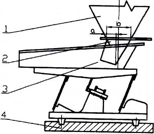 電磁振動(dòng)給料機(jī)的振幅和給料量受料倉倉壓影響較大,設(shè)計(jì)料倉時(shí)應(yīng)盡量減少倉壓,使溜咀后側(cè)板承受一定的倉壓,并設(shè)置斜溜沮及下料閘門。如圖,一般a=1/4b。溜咀四周應(yīng)與給料槽留有一定的間隙,一般5~10mm,以免產(chǎn)生噪音及影響振動(dòng)。