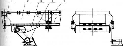 ZSW系列振動喂料機(jī)是利用兩個呈特定位置的偏心軸以齒輪相嚙合而組成激振器,裝配時必須使兩齒輪按標(biāo)記相嚙合,然后通過電機(jī)驅(qū)動,使兩偏心軸旋轉(zhuǎn),從而產(chǎn)生巨大合成的直線激振力,使機(jī)體在支承彈簧上作強(qiáng)制振動,物料則以此振動為動力,在料槽上作滑動及拋擲運(yùn)動,從而使物料前移而達(dá)到給料目的。當(dāng)物料通過槽體上的篩條時,較小的料可通過篩條間隙而落下,可不經(jīng)過下道的破碎工序,起了篩分的效果。產(chǎn)品結(jié)構(gòu)及技術(shù)參數(shù)
